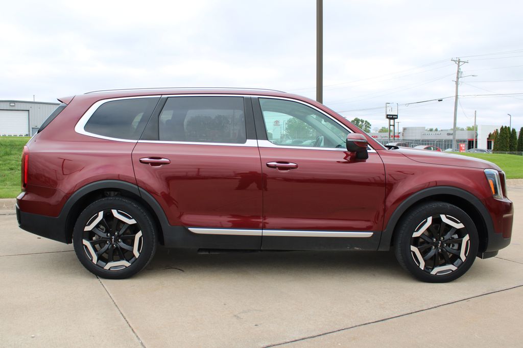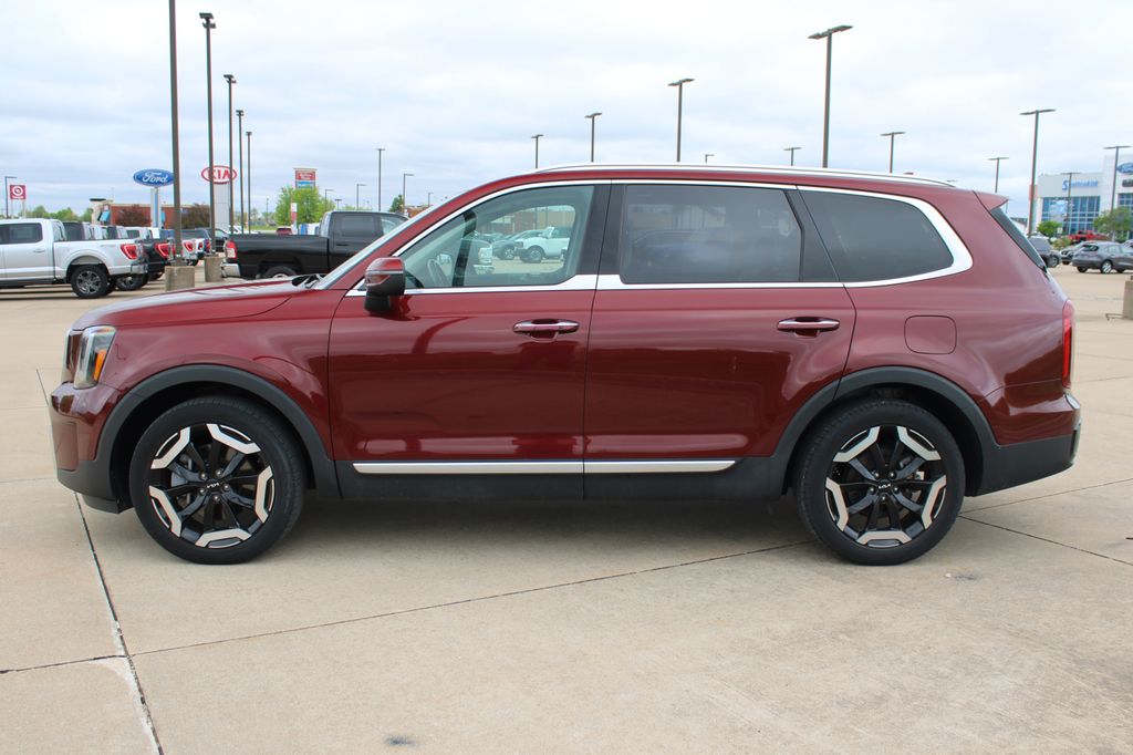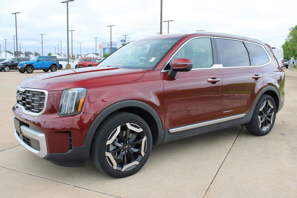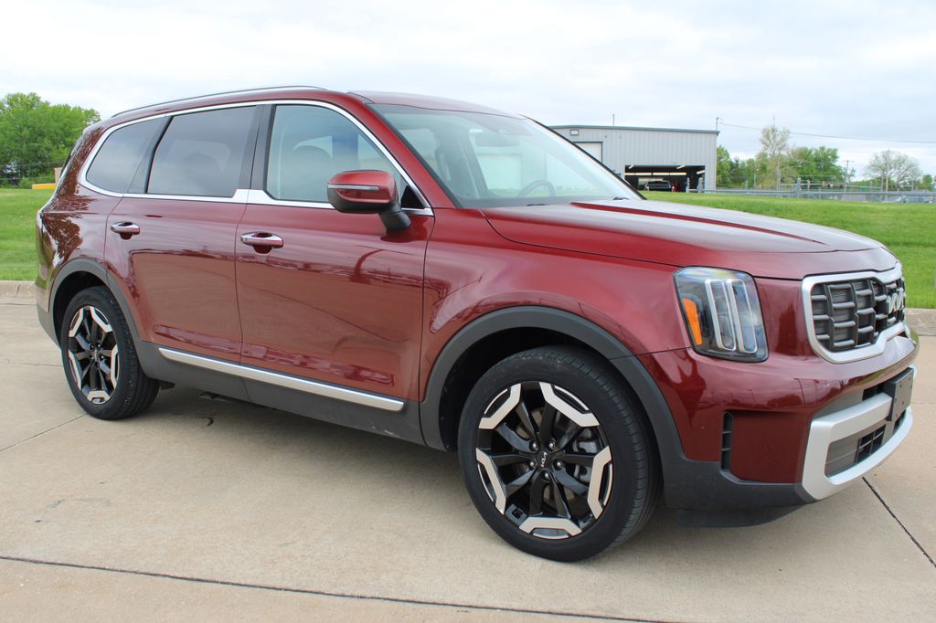 2023 Kia Telluride S Dawning Red 4D Sport Utility 3.8L V6 DGI DOHC Dual CVVT 8-Speed Automatic AWD S This vehicle comes well equipped with S Sunroof Package (Power Sunroof w/Sunshade), 3.648 Axle Ratio, 3rd row seats: split-bench, 4-Wheel Disc Brakes, 6 Speakers, ABS brakes, Air Conditioning, Alloy wheels, AM/FM radio: SiriusXM, Apple CarPlay & Android Auto, Auto High-beam Headlights, Automatic temperature control, Brake assist, Bumpers: body-color, Carpet Floor Mats, Delay-off headlights, Driver door bin, Driver vanity mirror, Dual front impact airbags, Dual front side impact airbags, Electronic Stability Control, Emergency communication system: 911 Connect, Exterior Parking Camera Rear, Four wheel independent suspension, Front anti-roll bar, Front Bucket Seats, Front Center Armrest, Front dual zone A/C, Front reading lights, Fully automatic headlights, Heated door mirrors, Heated Front Bucket Seats, Heated front seats, Illuminated entry, Knee airbag, Leather Shift Knob, Leather steering wheel, Low tire pressure warning, Navigation System, Occupant sensing airbag, Outside temperature display, Overhead airbag, Overhead console, Panic alarm, Passenger door bin, Passenger vanity mirror, Power door mirrors, Power driver seat, Power steering, Power windows, Radio data system, Radio: AM/FM Display Audio System, Rear air conditioning, Rear anti-roll bar, Rear audio controls, Rear reading lights, Rear side impact airbag, Rear window defroster, Rear window wiper, Reclining 3rd row seat, Remote keyless entry, Roof rack: rails only, Security system, Smart Key w/ Push Button and Remote Start, Speed control, Speed-sensing steering, Split folding rear seat, Spoiler, Steering wheel mounted audio controls, SynTex Synthetic Leather Seat Trim, Tachometer, Telescoping steering wheel, Tilt steering wheel, Traction control, Trip computer, Turn signal indicator mirrors, Variably intermittent wipers, and Wheels: 20" x 7.5" Black Finish.